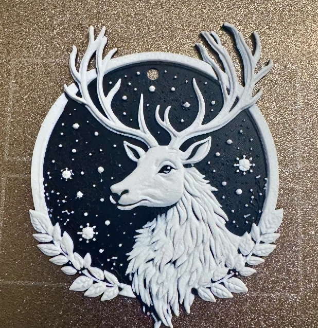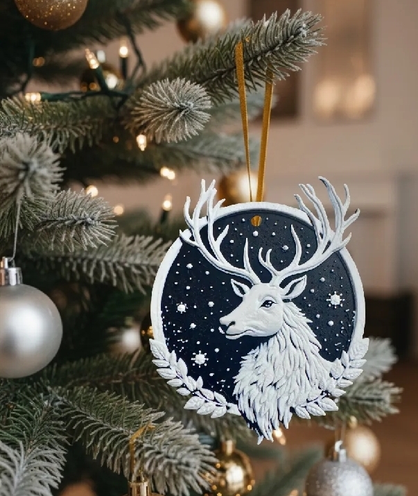 Bring a touch of winter magic to your tree with our celestial stag ornament. Featuring a majestic white deer under a starry night sky, this piece blends woodland wonder with festive charm.